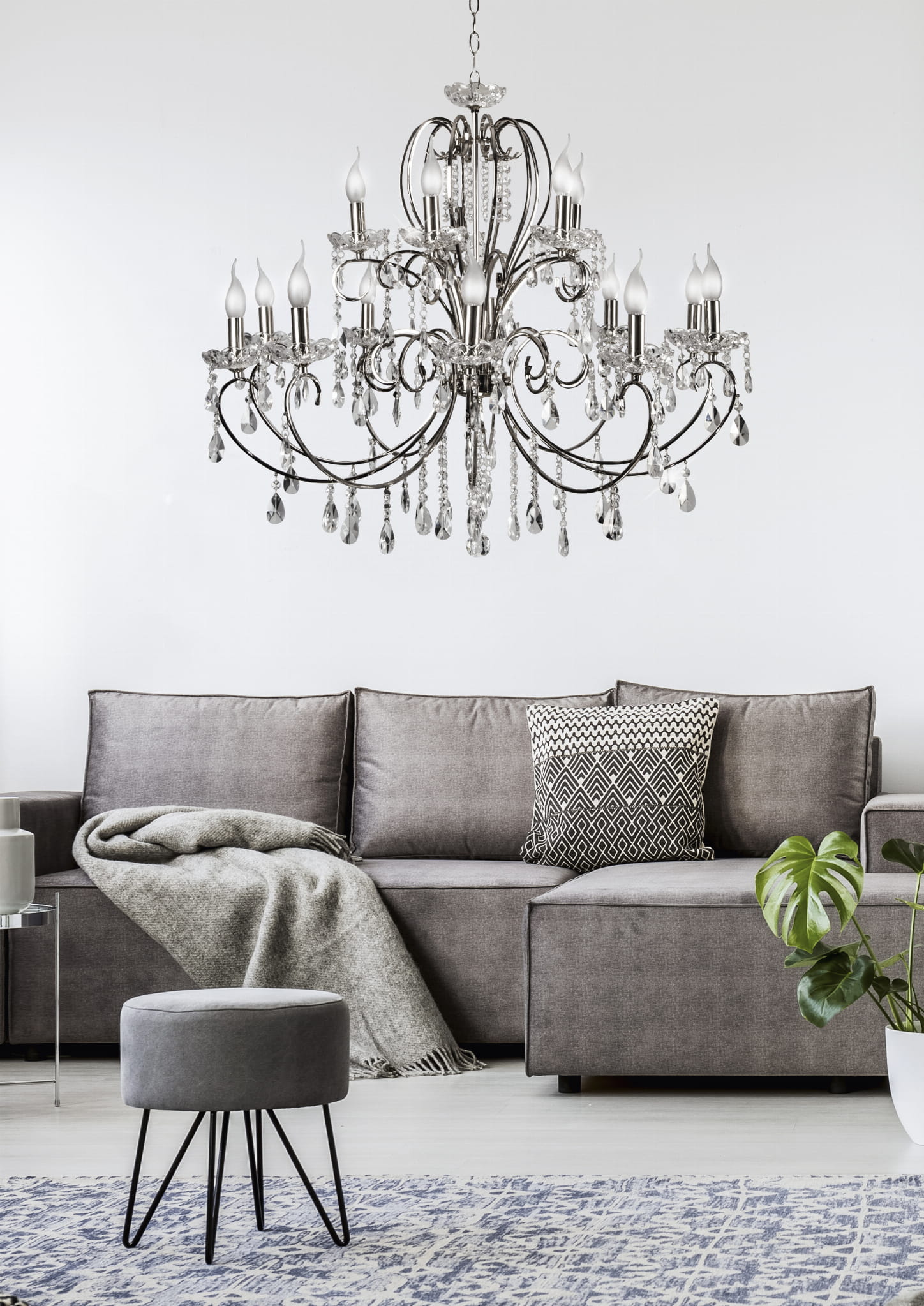 Kolor: chromowy, Materiał: podstawa stalowa, łańcuch, elementy ozdobne szklane, bez kloszy