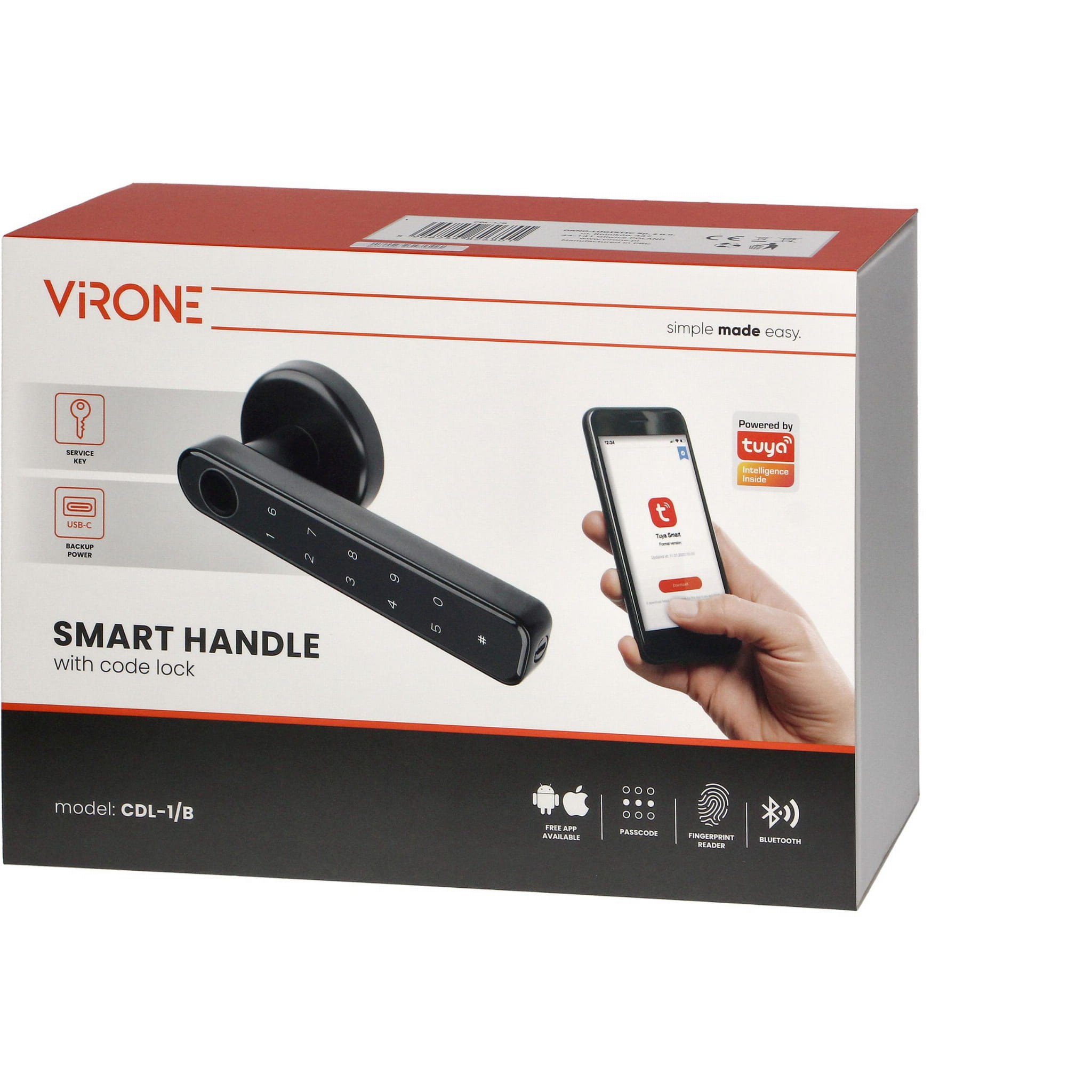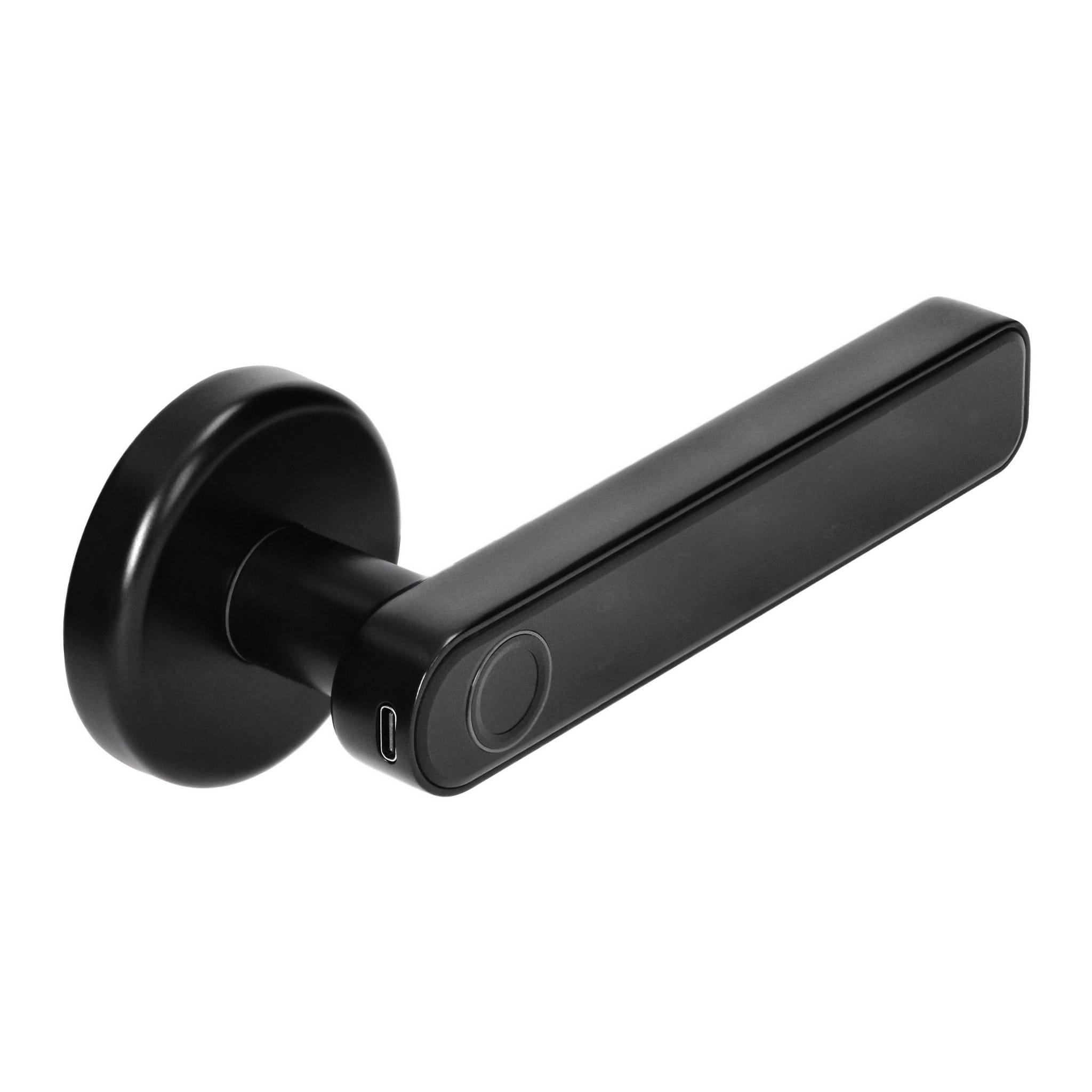 Nowoczesna klamka szyfrowa z dotykową klawiaturą i czytnikiem linii papilarnych, którą możemy zastosować zarówno w drzwiach prawych jak i lewych, w miejscu montażu tradycyjnej klamki. Możemy ją otworzyć wprowadzając kod PIN użytkownika, skanując zapamiętany wcześniej odcisk lub przez połączenie bluetooth z aplikacją w telefonie. Możemy ją montować w drzwiach grubych (max. 56 mm) i cienkich (min. 38 mm) dzięki dołączonym śrubom mocującym, elegancki i uniwersalny kształt klamki pasuje do wielu rodzajów drzwi. Klamka posiada awaryjną wkładkę patentową dzięki której można otworzyć drzwi po awarii elektroniki, oraz awaryjne gniazdo ładowania USB-C na wypadek rozładowania baterii. Kolor czarny.