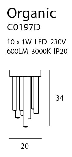 Lampy Organic będą wspaniałą ozdobą do luksusowych i nowoczesnych wnętrz. Zbudowane są z kilkunastu nieregularnych walcowatych brył, zakończonych elementem świetlnym, które zapewnią szeroki strumień jasnego światła. Rodzina Organic składa się z plafonów, lamp wiszących oraz kinkietów, oferowanych w co najmniej dwóch atrakcyjnych metalicznych kolorach.