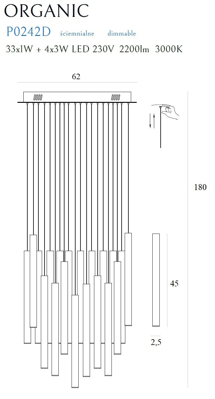 Lampy Organic będą wspaniałą ozdobą do luksusowych i nowoczesnych wnętrz. Zbudowane są z kilkunastu nieregularnych walcowatych brył, zakończonych elementem świetlnym, które zapewnią szeroki strumień jasnego światła. Rodzina Organic składa się z plafonów, lamp wiszących oraz kinkietów, oferowanych w co najmniej dwóch atrakcyjnych metalicznych kolorach.