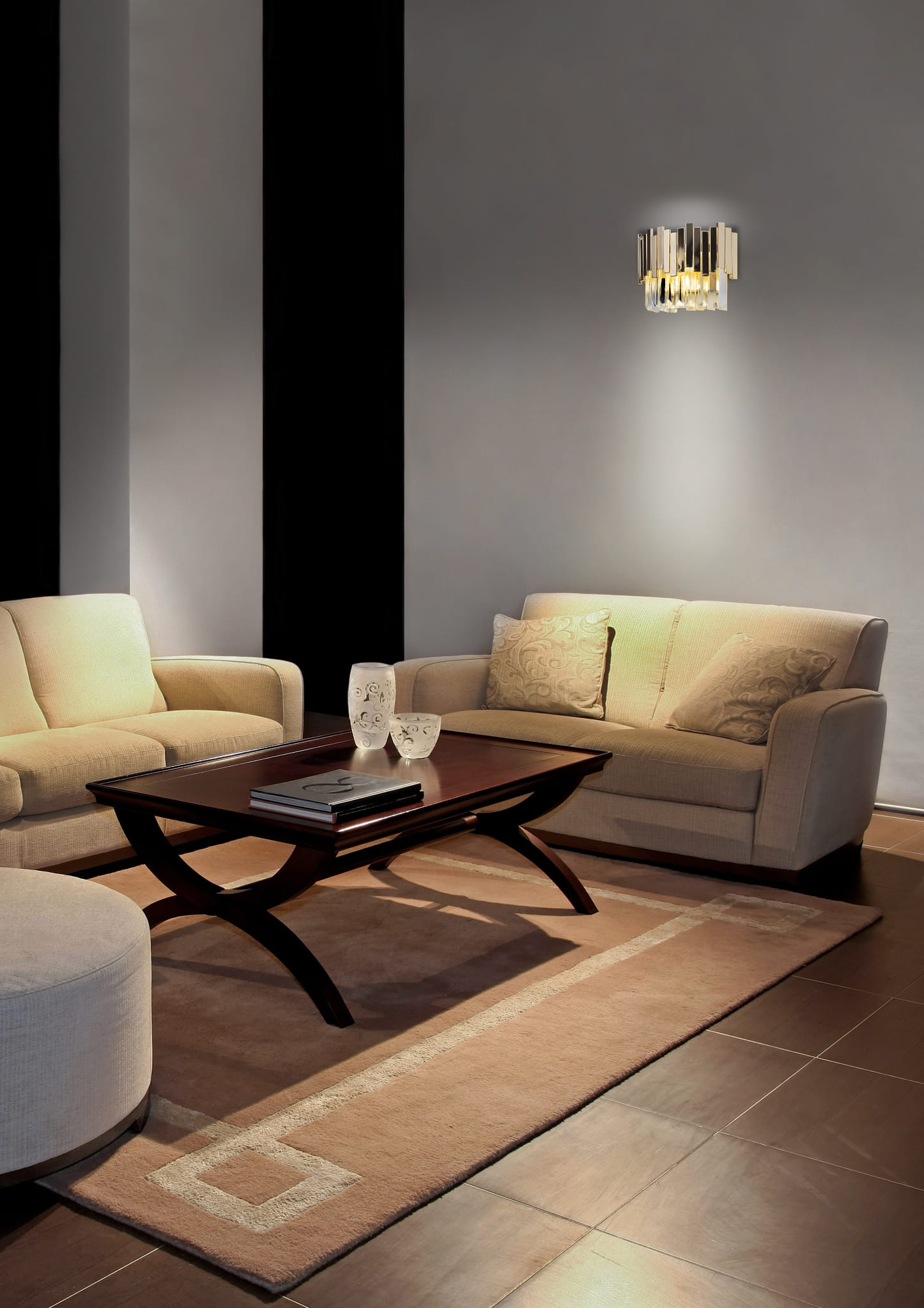 Kinkiet Trend jest doskonałym rozwiązaniem do wnętrz, które potrzebują blasku złota, dobrego designu i dużej ilości ciepłego światła. Kryształowe sople są zawieszone pionowo w zwarte, koncentrycznie ułożone okręgi.