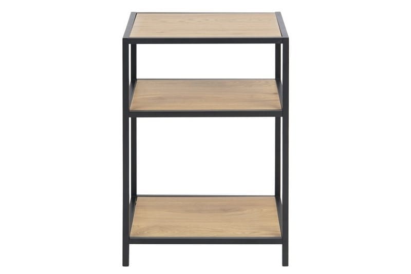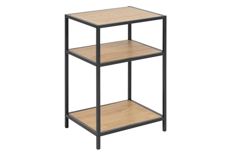 Stolik Nocny Seaford wykonany został z metalu malowanego proszkowo oraz płyty MDF wykończonej laminatem w kolorze dębu. Regał doskonale sprawdzi się jako stolik nocny w sypialni ale również funkcjonalny stolik obok sofy w salonie.