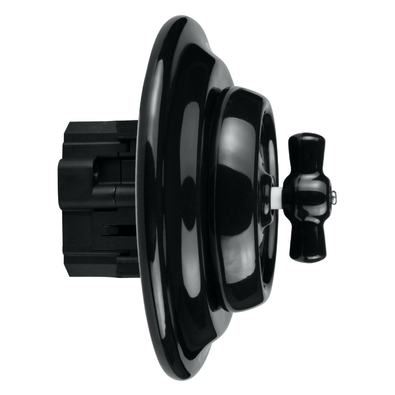 Ponadczasowy wygląd i styl ceramicznego włącznika obrotowego w kolorze czarnym bardzo dobrze będzie pasować zarówno do wnętrz retro jak i nowoczesnych. Włącznik sprzedawany jest razem z ramką pojedynczą, kompletny i gotowy do montażu podtynkowego.