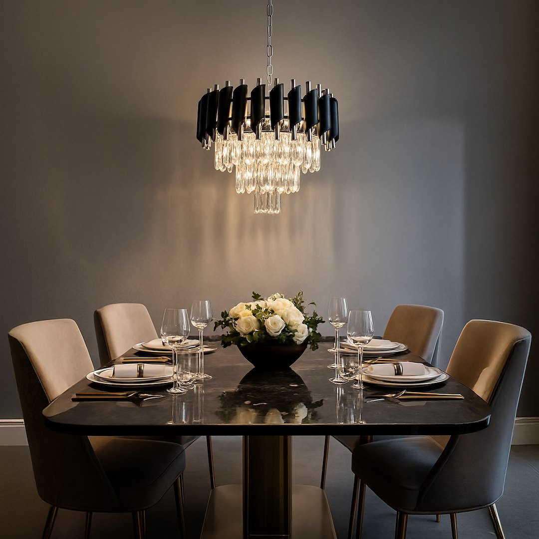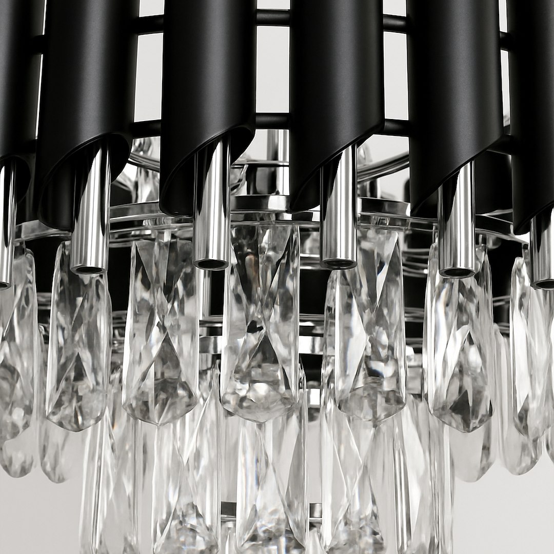 Żyrandol Cristal Chrome w wersji 5xE14 to elegancja w czystej postaci. Chromowane wykończenie i czarne metalowe elementy podkreślają nowoczesny charakter lampy, a kryształowe zawieszki nadają jej blask i lekkość. Kluczowe atuty: pięć punktów świetlnych E14 zapewniających równomierne oświetlenie, połączenie chłodnego chromu z głęboką czernią – nowoczesna klasyka, idealny do wnętrz w stylu modern glam, art déco lub contemporary, możliwość dopasowania do innych lamp z kolekcji Cristal. To oświetlenie, które stanie się centralnym punktem aranżacji – podkreślając luksusowy charakter domu, apartamentu czy przestrzeni hotelowej.